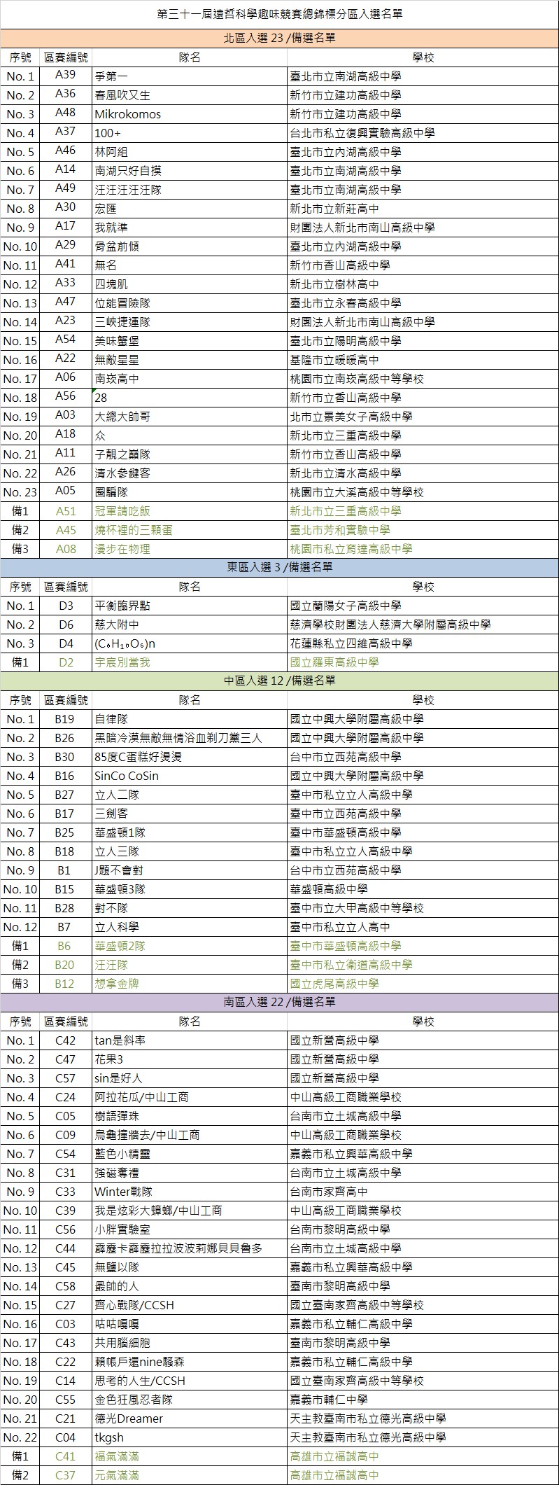 其它:澎湖縣、金門縣、連江縣,海外僑校(包括大陸地區)可自選上述任一區參賽。