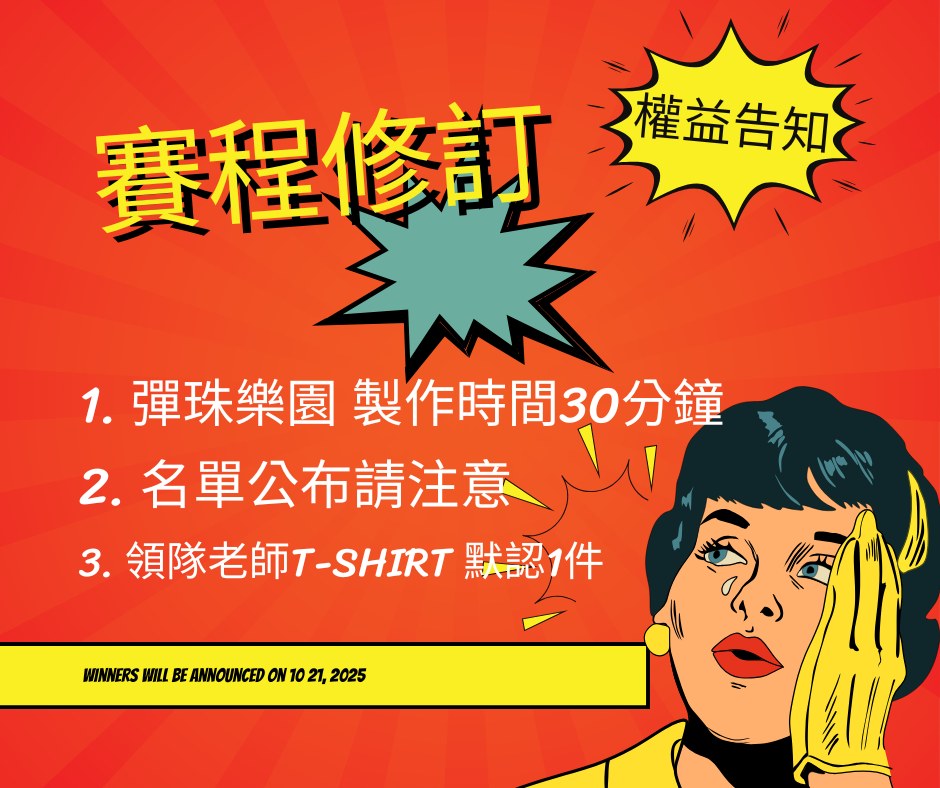 攸關賽程,因為今年三項目進行,為使流程順利,下午進行彈珠樂園2.0 & 快轉旋風對開窗口,所以將兩個項目製作時間調整為相同的30分鐘,以免競賽場間互相干擾影響競賽選手。