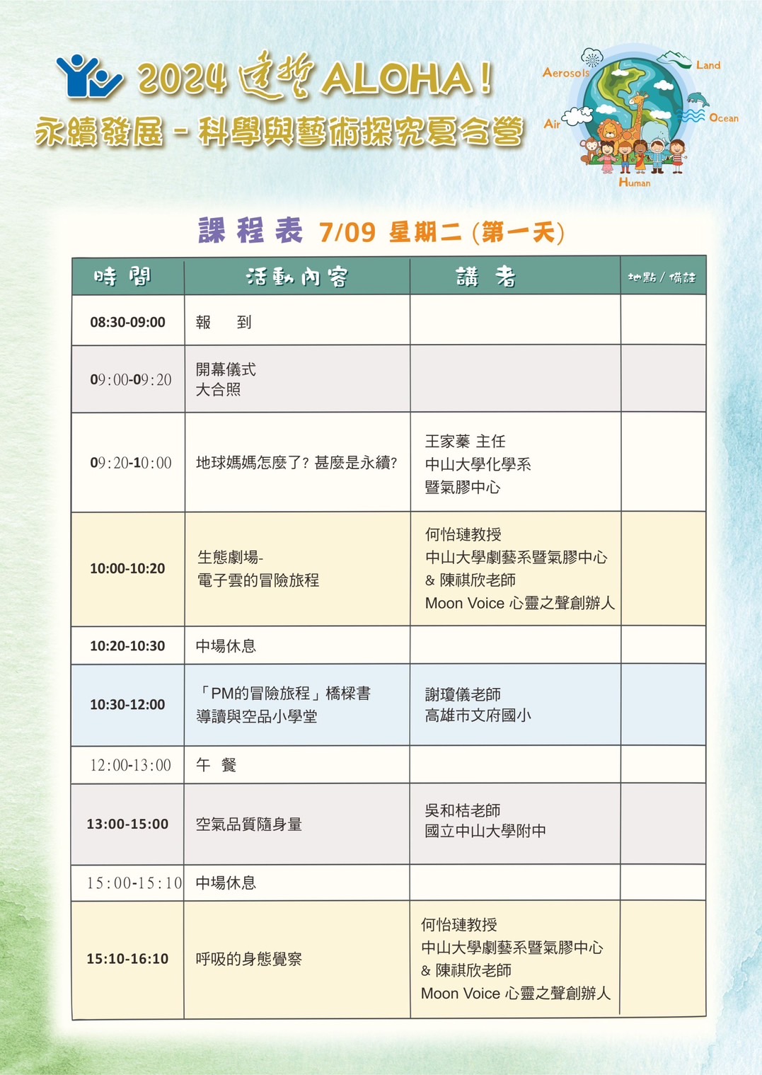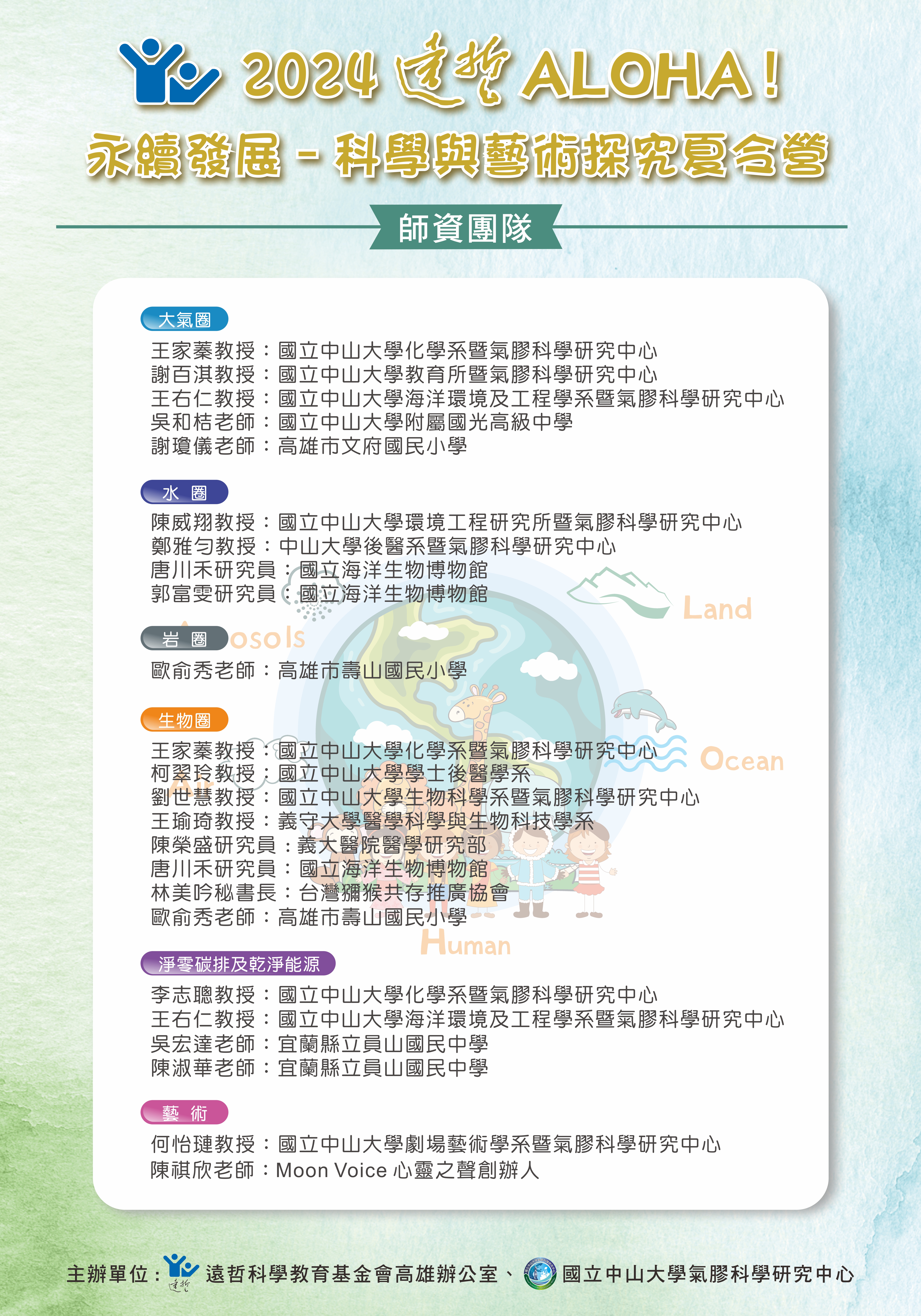 2024 遠哲 ALOHA! 永續發展-科學與藝術探究夏令營特別邀集了化學、生物、 醫學、環境工程、能源、動植物生態、教育、藝術等跨領域的專家學者, 包括亞洲唯一氣膠科學研究中心跨領域教授及K-12種子教師團隊、兩位師鐸獎得主、全國首位遠征南極進行生態調查的海生館研究員, 還有知名藝術家及音樂家共同帶領學員們深度認識氣膠與陸地、海洋、人類及空氣之間的相互依存的緊密關聯及地球永續發展的重要性,期喚醒我們與地球母親臍帶相連的生命共同體意識,從營隊課程中學習對地球母親更仁慈、友愛、溫和,並與地球上的陸地、海洋、空氣及萬物和諧永續共存。