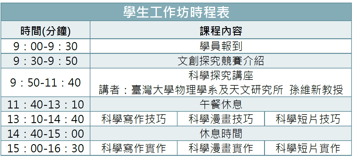 • 教師研習-對科學探究創作有興趣的各級學校教師。教師將透過工作坊專業講師指導,學習如何培養學生將自己的科學探究作品,以故事創作的方式表達。