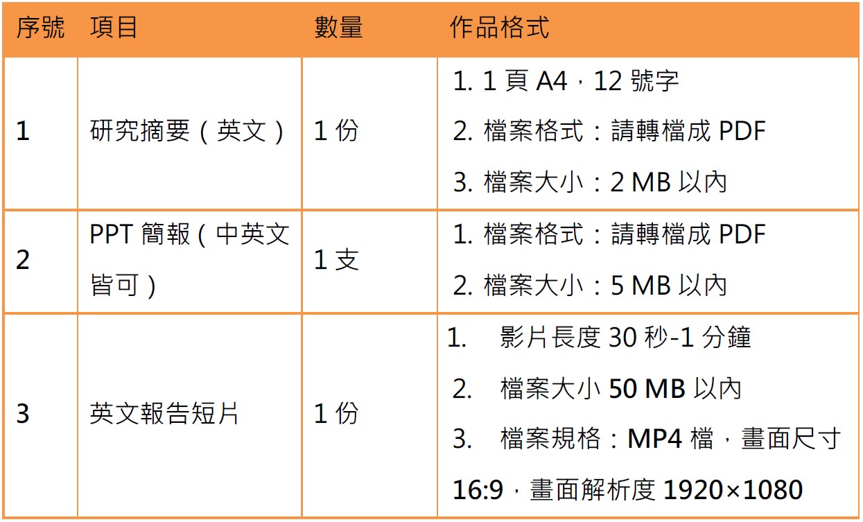 競賽形式:參賽者將進行3分鐘英語短講與2分鐘英文問答,說明探究過程與成果。團體組每位隊員皆須發表。