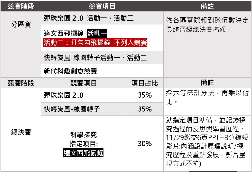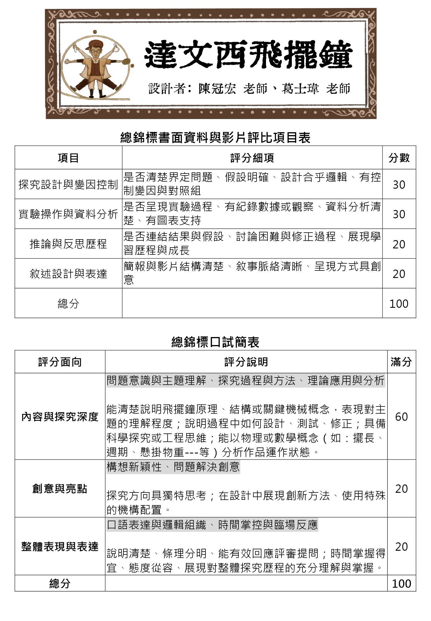 總決賽報名繳交作品指定項目達文西飛擺鐘:繳交6頁PPT+3分鐘短影片,內涵設計原理說明 / 探究歷程及重點發展,影片呈現方式不拘, 書面與影片資料審查佔分15%,口試佔分15%