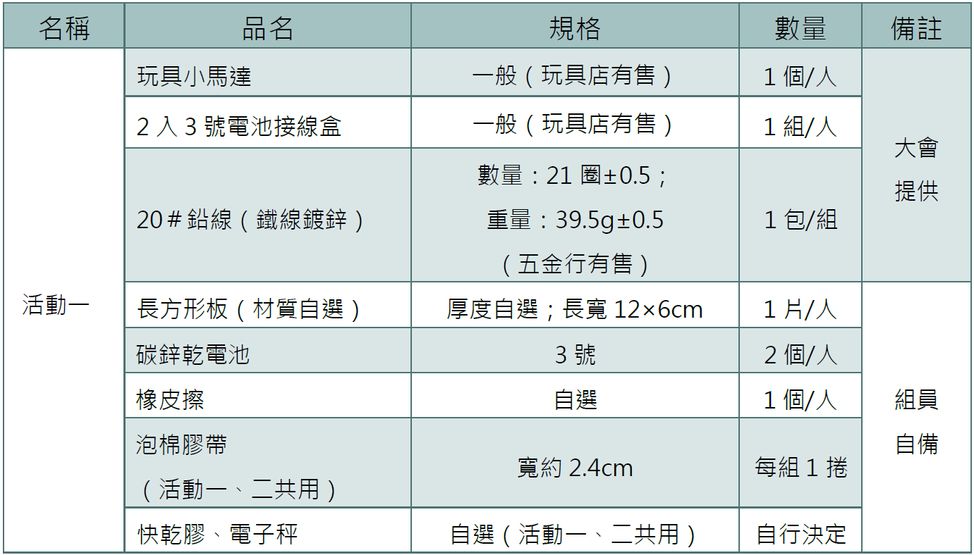 5. 競賽考題請勿設計需使用電源110V電壓的主題。 (可設計使用充電3號電池,以響應環保)。