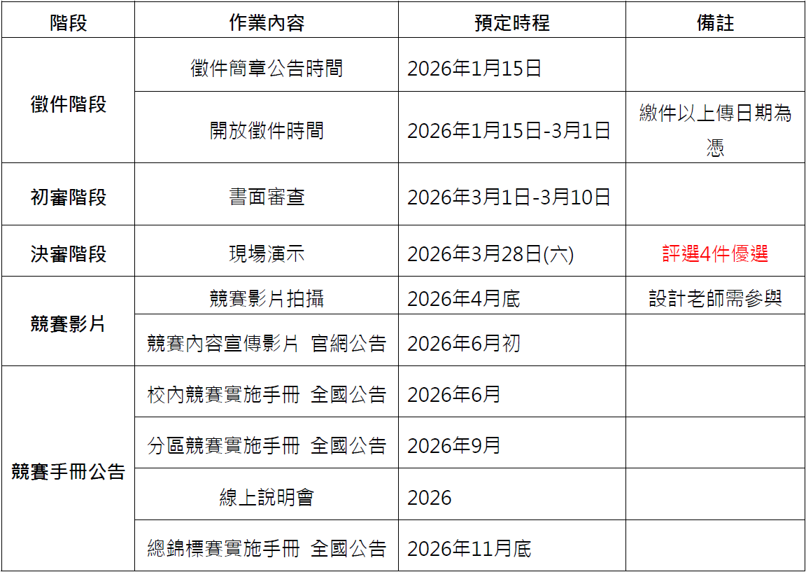 4、 競賽題型的設計,請以每位參賽者皆能完成1組作品為優先;若該題型需3人合製,也需要求每隊完成2組作品,以避免僅製作1組作品卻失常,導致該隊伍不能參賽。
